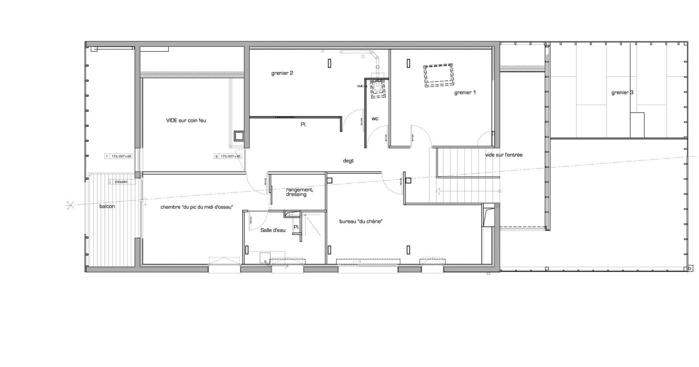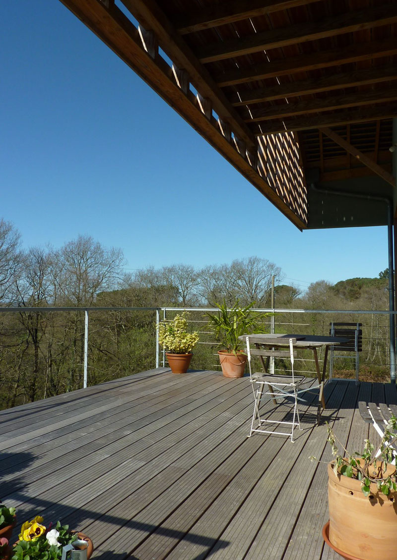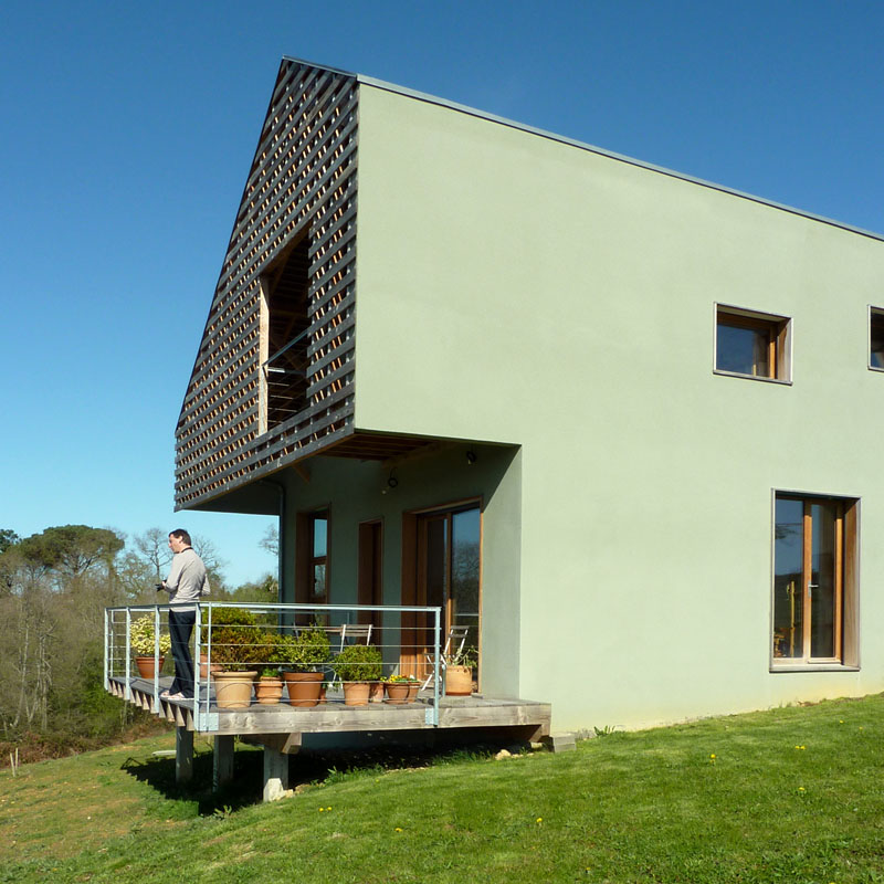 Une architecture bioclimatique où les espaces de services sont au Nord, où l'emplacement des pièces de vie est rythmé par la course du soleil: cuisine, sdb, chambres à l'Est, séjour-salle à manger avec triple orientation, chambre d'amis, bureau, grenier à l'Ouest.