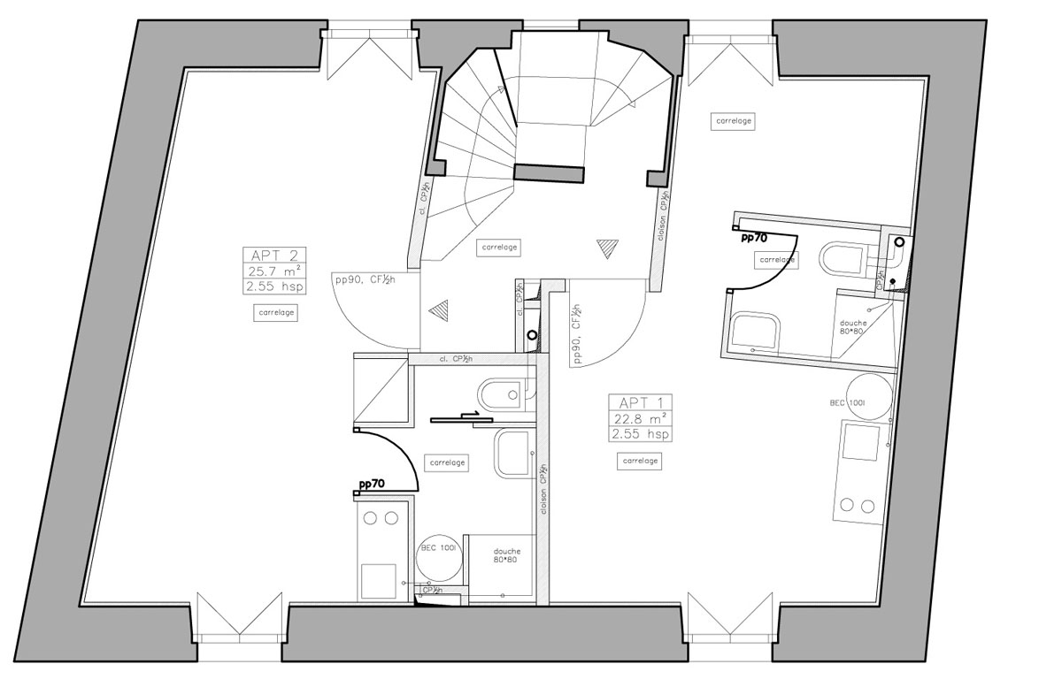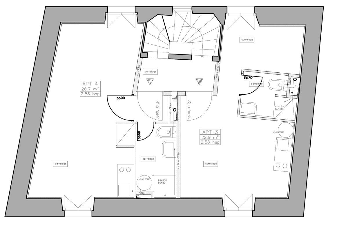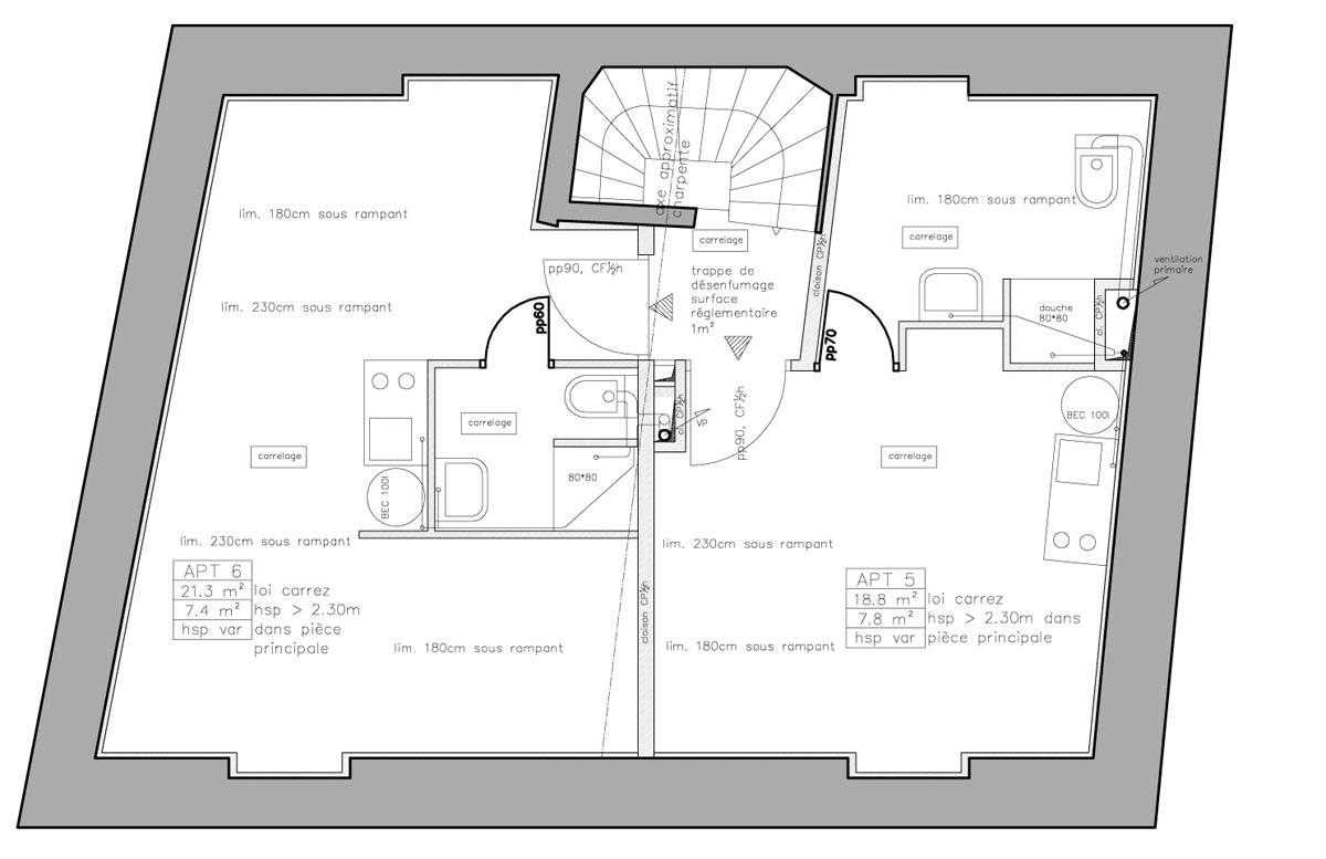 | Travaux: | Reprise du Gros-oeuvre, partitionnement intérieur, vmc collective, sécurité incendie. |