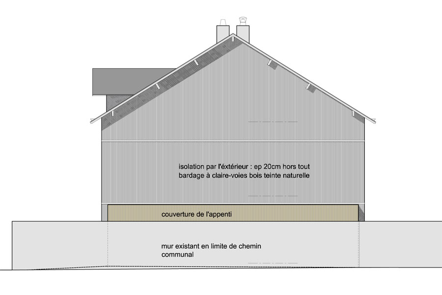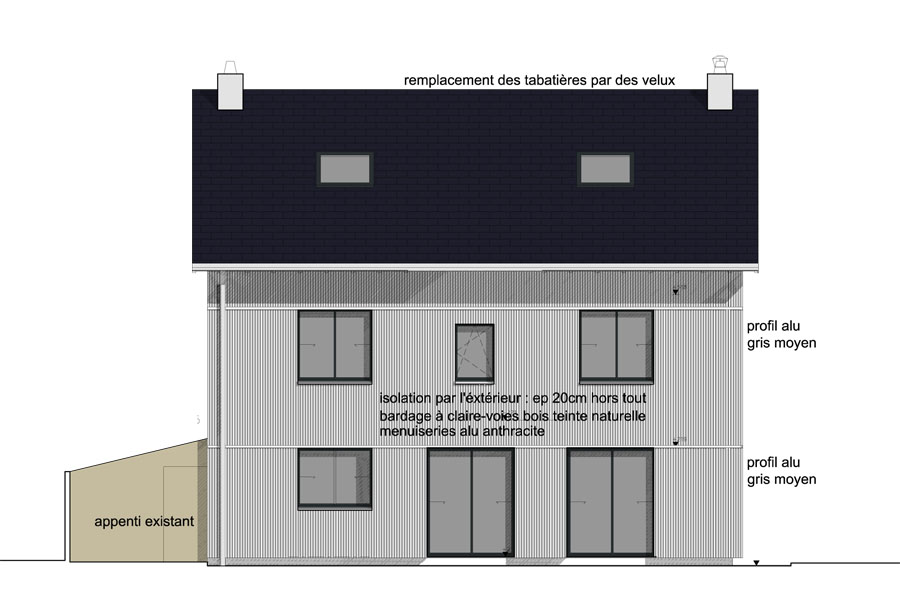 | Rénovation conforme ANAH suivi par SOLIHA, RT2012 "existant" dit calcul par élément, TVA limitée pour les prestations d'amélioration thermique, ITE, bardage brut | |
