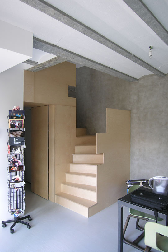 Les 2 escaliers s'expliquent alors par le programme de l'étage "coincé" sous les rampants de la toiture générés par le gabarit. Sans ce doublon, le couloir nécessaire rend impossible le maintien d'une salle d'eau et réduit la surface au sol de la chambre centrale. Les 2 escaliers ne sont donc pas absurdes. Ils apportent en plus l'autonomie parents / enfants et la singularité d'un fonctionnement en boucle.